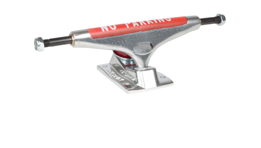 Be a menace to your local strip mall owners while you grind your graphics off all day in front of their stores with Krux K5 No Parking Standard DLK trucks with polished silver hanger and baseplate, curb graphic, silver hardware, and the elusive red Krux cushions for posterity.