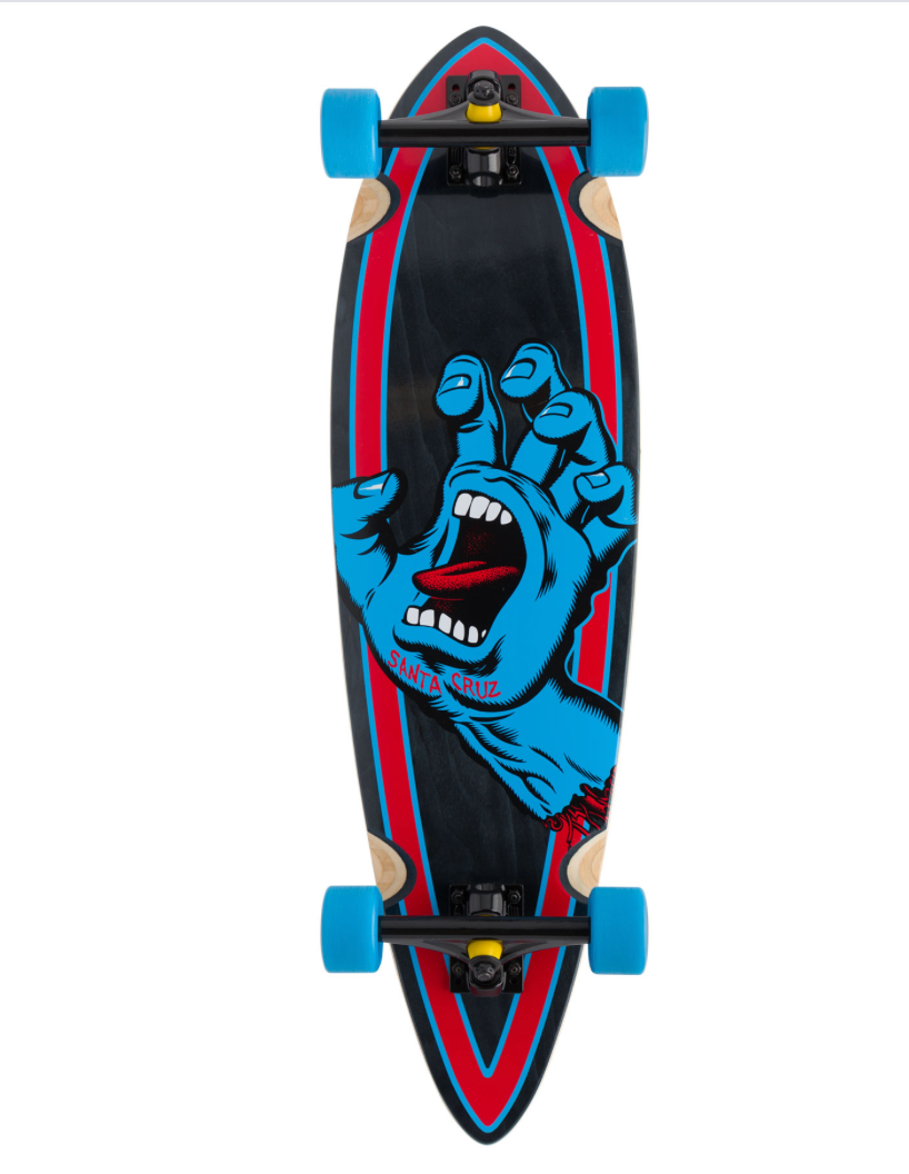 Santa Cruz Skateboards Screaming Hand Pintail Cruiser with smaller pintail shape on 9 ply deck curtain coated with clear grit, Bullet 160mm reverse kingpin trucks, and Santa Cruz branded 60mm 78a Slime Balls wheels.