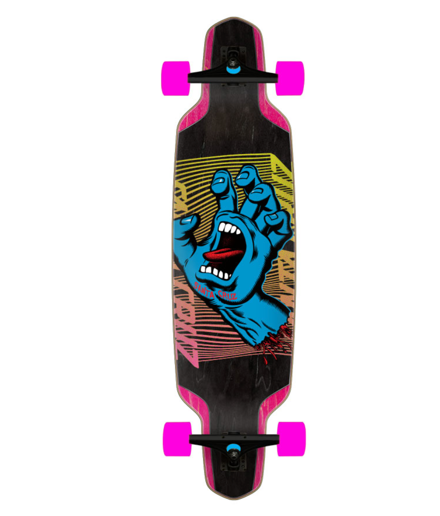 Santa Cruz Skateboards Split Hand Dropdown Longboard Cruzer with updated, modern medium sized drop down shape with routed wheel wells, new 160mm Bullet reverse kingpin downhill trucks and 66mm Santa Cruz branded Slime Balls wheels.