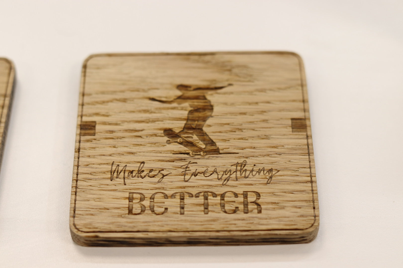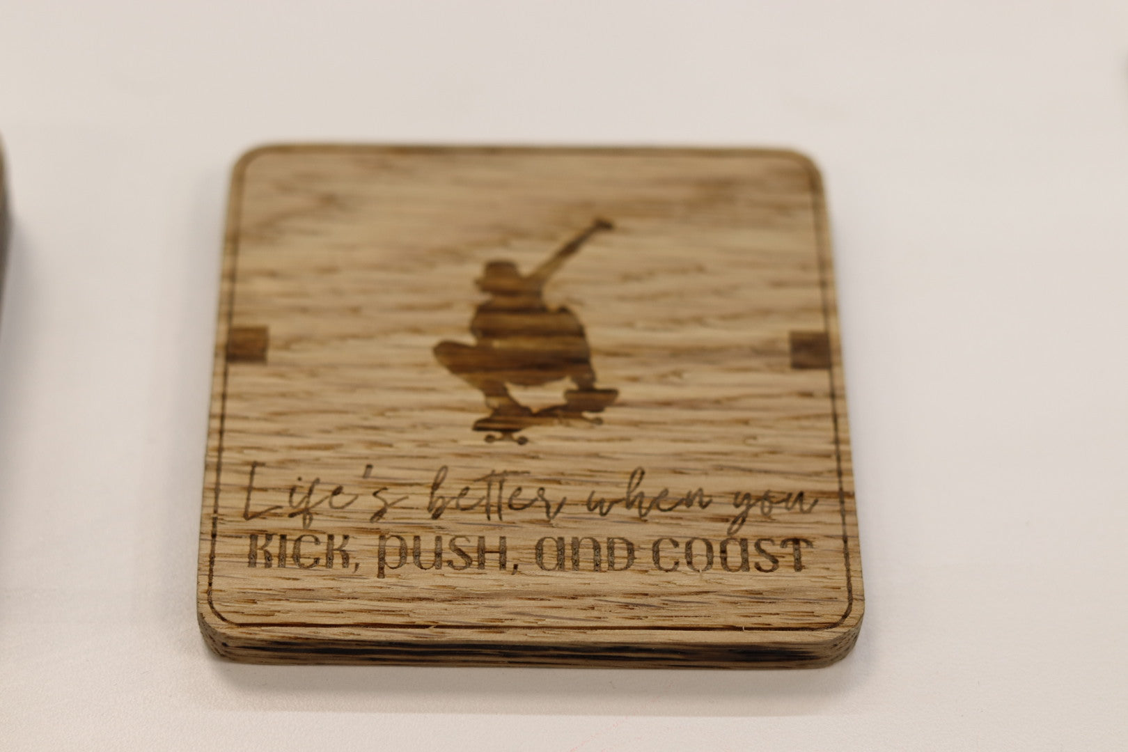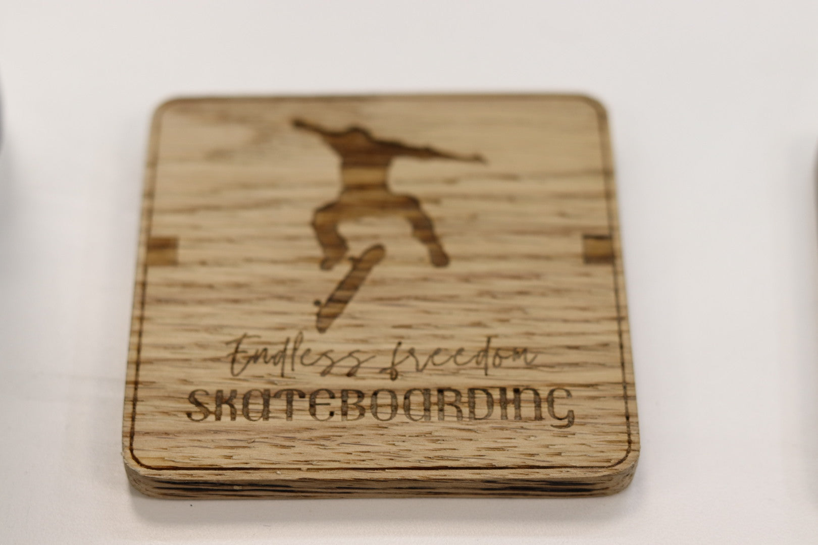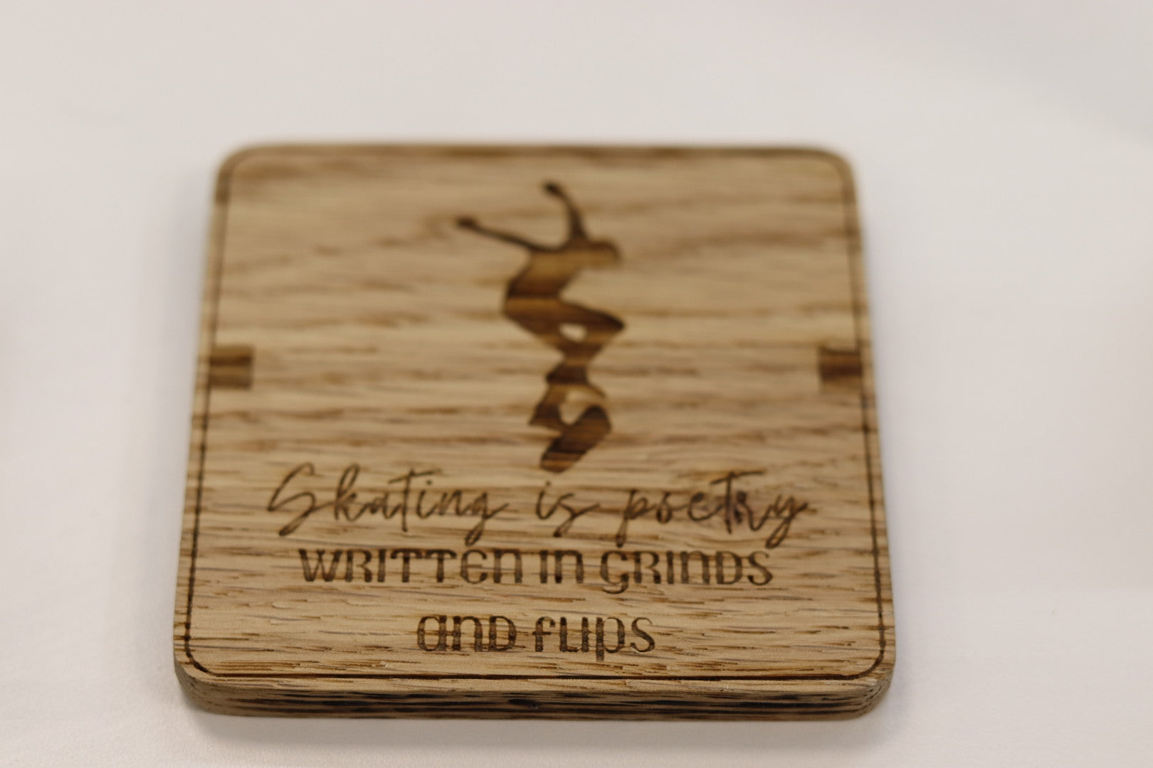 Crafted from solid oak, this coaster set is perfect for skaters who want a touch of their passion off the board. Each coaster is laser-engraved with a skateboarding-inspired design, combining natural wood grain with skate culture vibes.