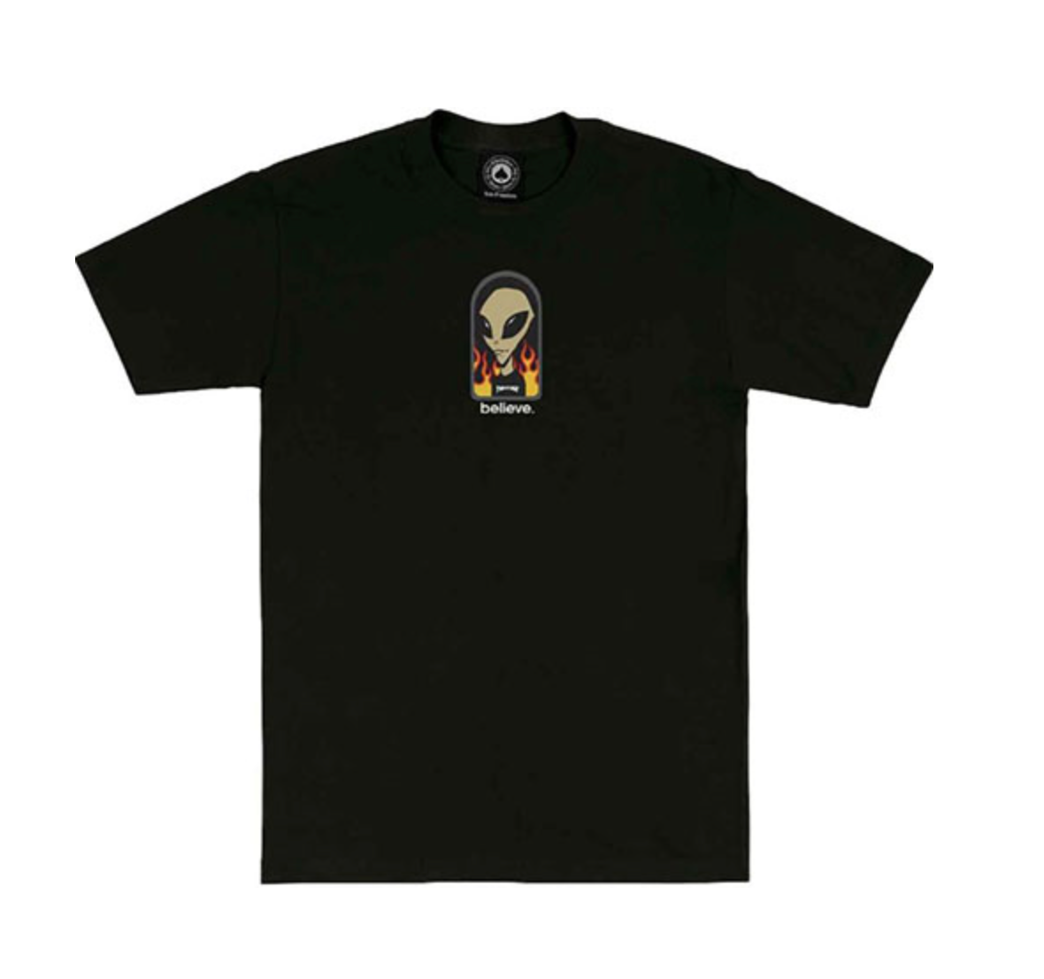 The Thrasher x AWS Believe Black SS S is a small-sized short-sleeve t-shirt in black featuring a collaboration between Thrasher and Anti-Hero Skateboards (AWS). The shirt showcases the "Believe" graphic, combining Thrasher's legendary skate brand imagery with Anti-Hero's rebellious and gritty design. The graphic is printed with high-definition quality, ensuring vibrant colors and lasting durability. Made from soft, breathable cotton, this tee is perfect for skateboarding or casual everyday wear, offering both comfort and style. It's a must-have for fans of both iconic skate brands.