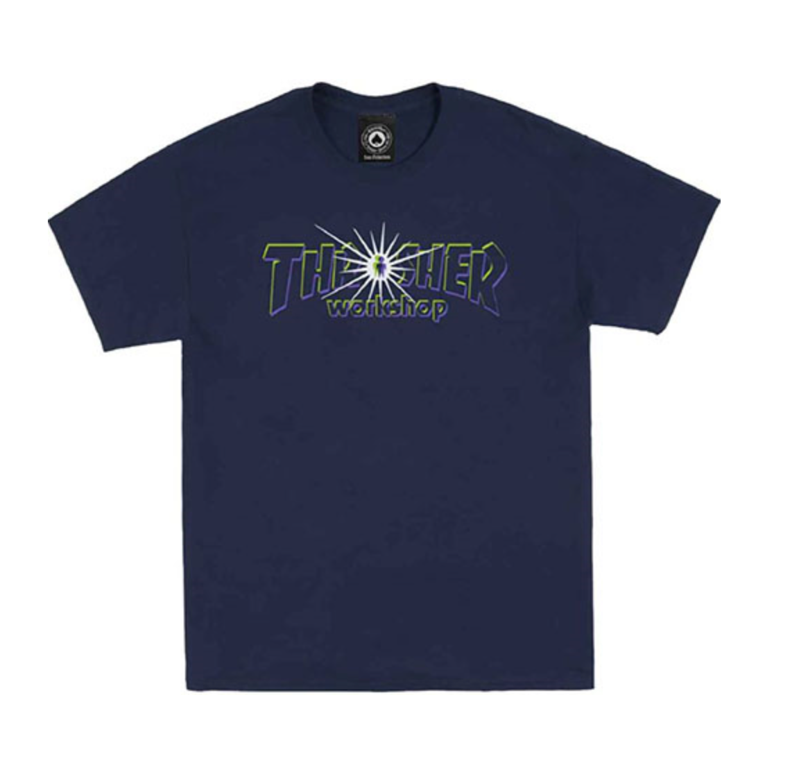 The Thrasher x AWS Nova Navy SS S is a small-sized short-sleeve t-shirt in a navy blue color. It features the Nova graphic from the collaboration between Thrasher Magazine and Anti-Hero Skateboards (AWS). The shirt prominently displays a blend of both brand logos and graphic elements, offering a bold yet stylish representation of skate culture. Made from comfortable and breathable fabric, this tee is a great fit for skate enthusiasts or anyone who enjoys the fusion of streetwear and skateboarding aesthetics.