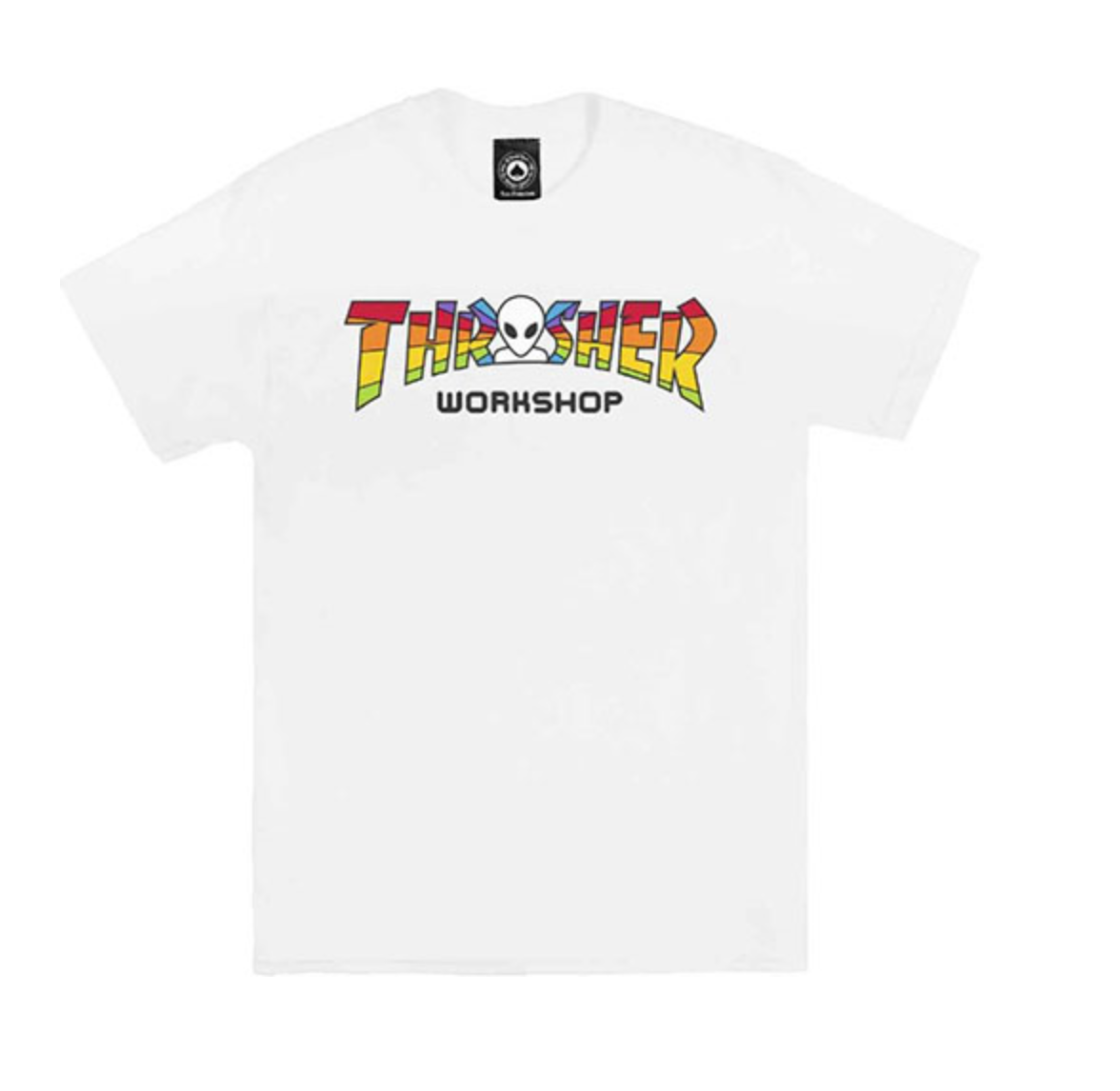 The Thrasher x AWS Spectrum White SS S is a small-sized short-sleeve t-shirt in white, featuring a collaboration between Thrasher Magazine and Anti-Hero Skateboards (AWS). This shirt is likely part of the Spectrum series, showcasing unique graphic designs that blend Thrasher's iconic flame logo with Anti-Hero's bold, rebellious aesthetic. The white base color offers a clean, versatile look, making it a great option for skateboarding or casual wear. Made from soft cotton, it's comfortable and perfect for everyday use, with a design that stands out among skate enthusiasts.